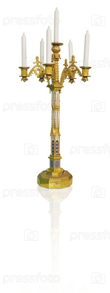 Восковые свечи в золотом готическом светильнике изолированы на белом фоне