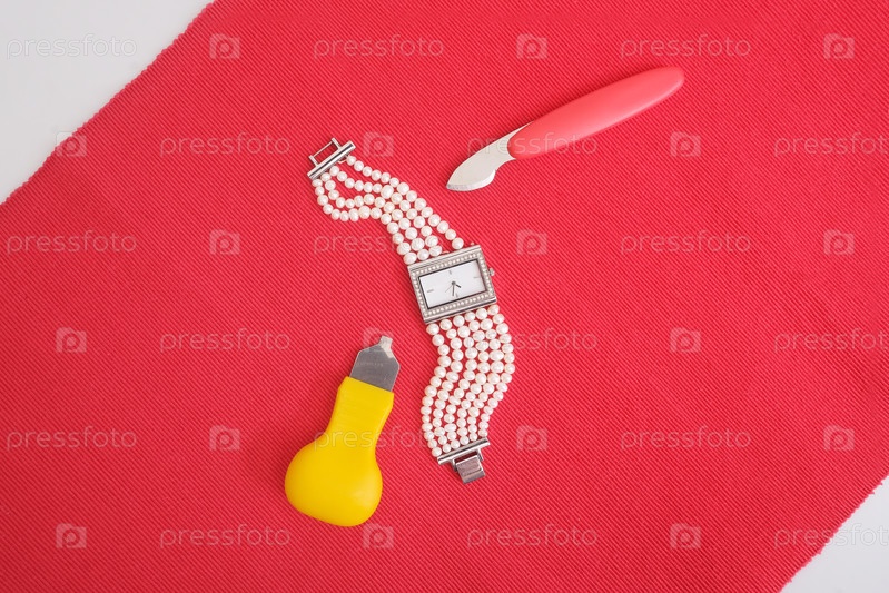 Натюрморт с жемчужными часами и часовыми инструментами на красном фоне