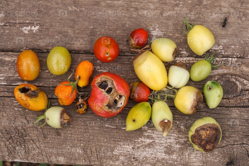 Муравьи ползут к помидорам, которые испорчены вредителями и верхним гниением