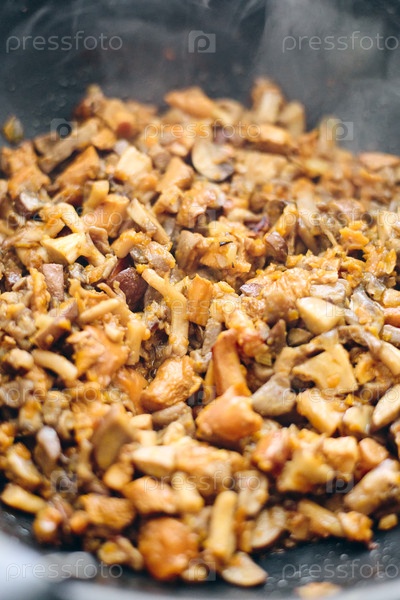 Фино нарезанные гербилы, устричные грибы и грибы жарят в сковороде.Процесс приготовления