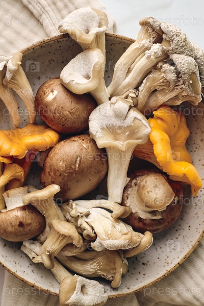 Свежие дикие грибы: люстры, устричные грибы и грибы на тарелке на легком столе