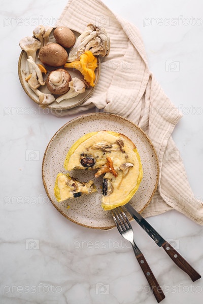 Кихе с шантереллами, устричными грибами, грибами и сыром, кусок кише отрезанный для еды на тарелке