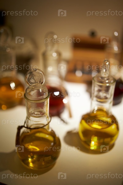 Эфирные масла в стеклянных бутылках на ярмарке ремесел, теплое освещение на деревянном столе