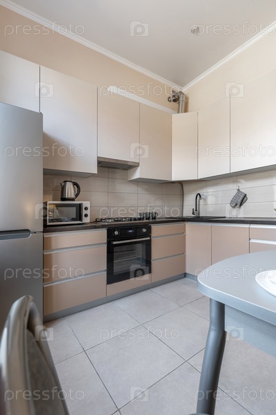 Современная бежевая кухня с обеденным помещением и черной столешницей