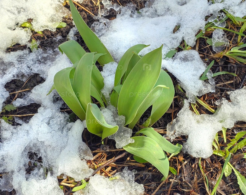 Листья тюльпанов в снегу