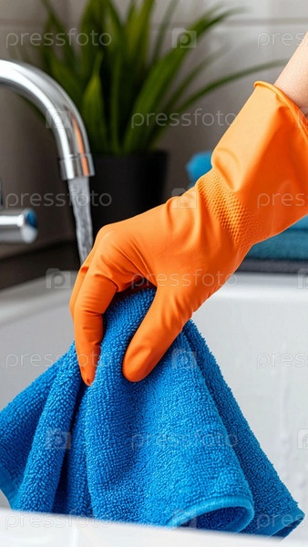 Рука в перчатке держит салфетку из микроволокна для чистки сантехники