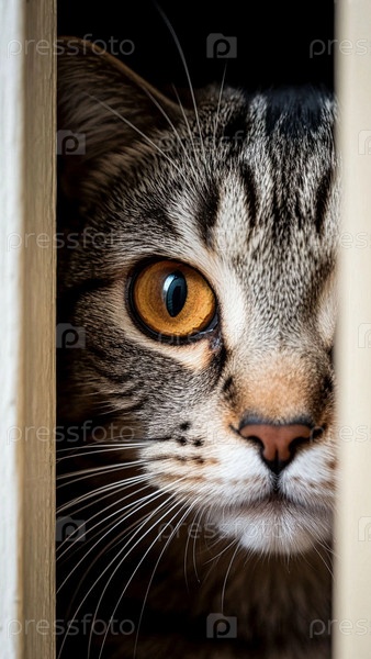 Полосатый кот смотрит сзади двери