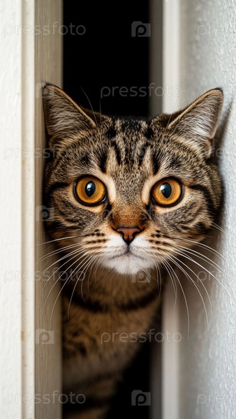 Любопытный кот смотрит в дверь с удивленным взглядом