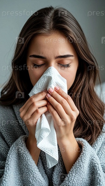 Холод, ОРВИ, больная девочка прикрывает лицо бумажной салфеткой во время простуды