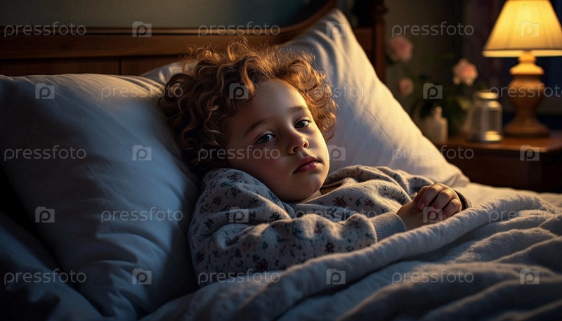 Печально больный маленький ребенок лежит в постели под одеялом