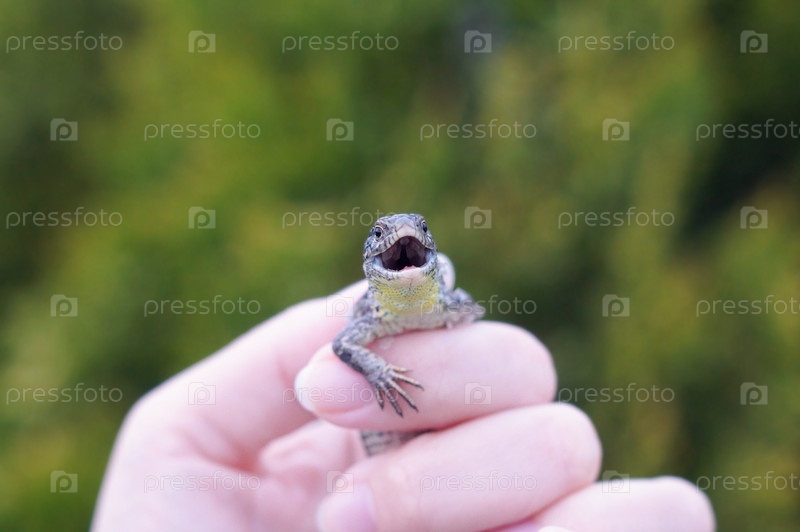 Поймана Ящерица (Lacerta agilis) с открытым ртом смотрит на нас