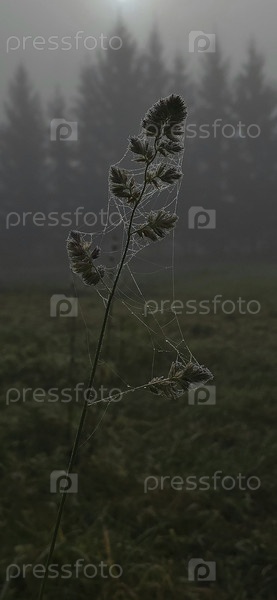 Трава в паутине на туманном утреннем дне