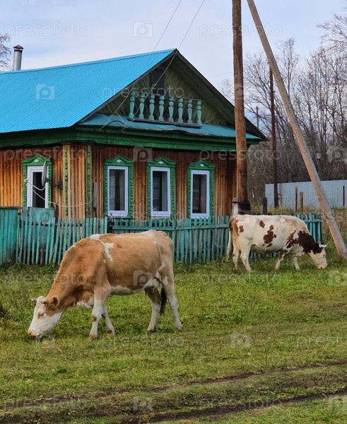 Коровы в деревянном сельском доме