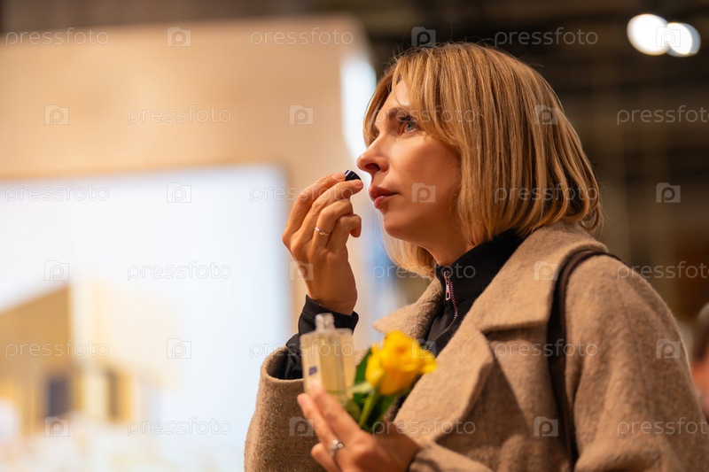 Женщина в бежевом пальто осматривает бутылку парфюма во время покупок в оживленном современном магазине.Она держит желтый цветок, создавая нежное и эстетическое настроение