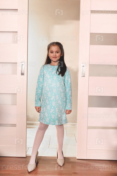 Молодая девушка в высоких каблуках, стоящая у двери и представляющая себе взросление
