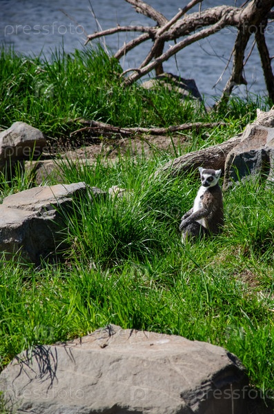 Лемур сидит на берегу реки среди зеленой травы и камней