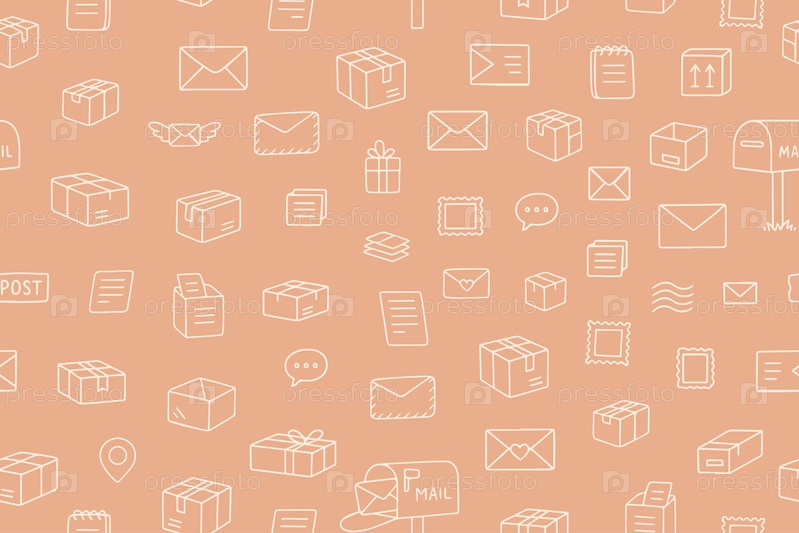 Бесшовный рисунок со скрипками с посылками, почтовыми ящиками, марками и конвертами