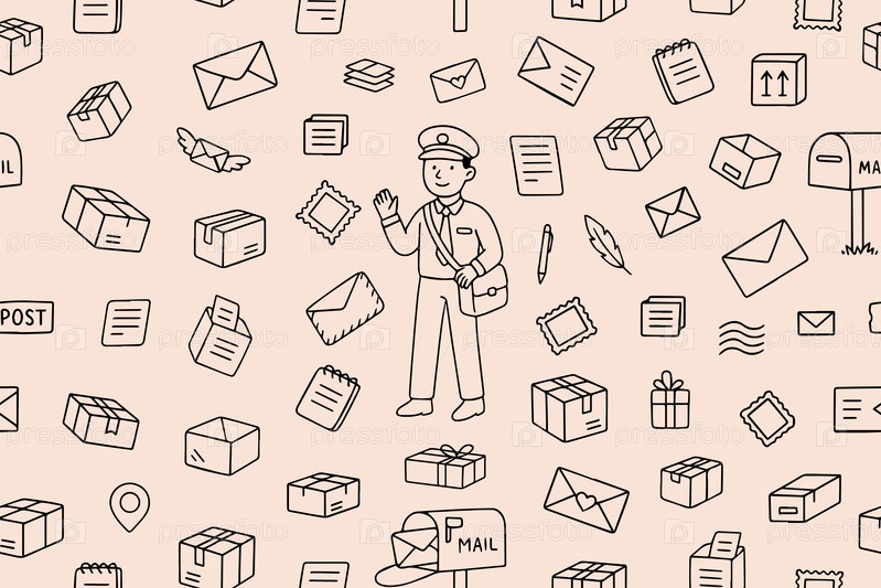 Бесшовный шаблон с почтовой темой. почтальон, почтовая техника, посылки, почтовые ящики, почтовые марки, конверты, служба доставки. векторная иллюстрация в стиле doodle
