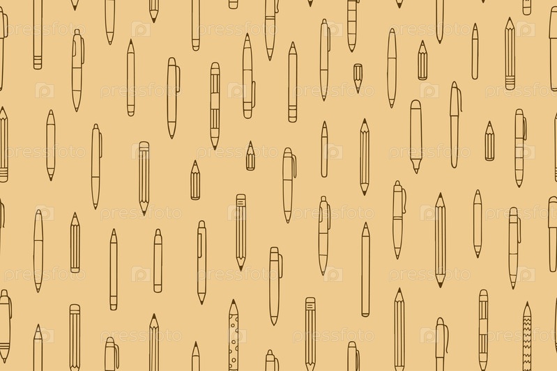 Бесшовный рисунок карандашами и карандашами. Ручно нарисованные письменные инструменты, включая шариковые ручки, фонтаны, механические карандаши и маркеры. Векторная иллюстрация на желтом фоне