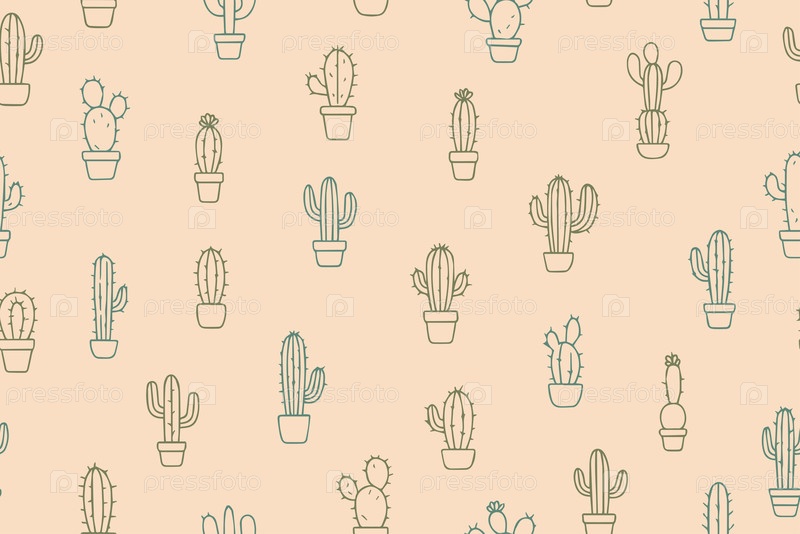 Бесшовный рисунок зеленых кактусов, нарисованных вручную. Экзотические шипастые растения в стиле doodle. Иллюстрация векторной линии