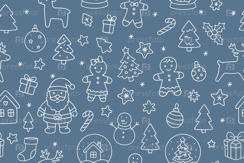 Бесшовный рисунок рождественских икон в стиле doodle. Санта, пряники, деревья и конфеты нарисованы вручную. Праздничный, модный фон для ваших проектов