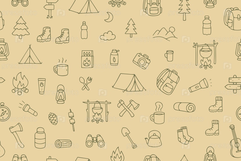Бесшовный рисунок элементов ручного кемпинга, путешествий и походов на зеленом фоне. модный фон для упаковки, листовок, шаблонов, открыток, печатных материалов и сувениров летнего лагеря