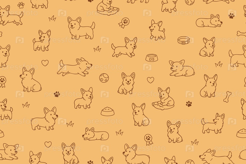 Бесшовный рисунок с милыми корги, в комплекте с отпечатками лап, костей и собачьих аксессуаров.Идеально подходит для проектов и проектов, связанных с домашними животными