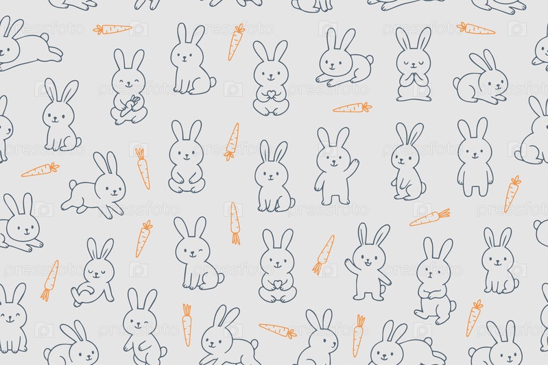 Векторный бесшовный рисунок с кроликами в разных позах. Плоский стиль повторяется на заднем плане. Иллюстрация вектора