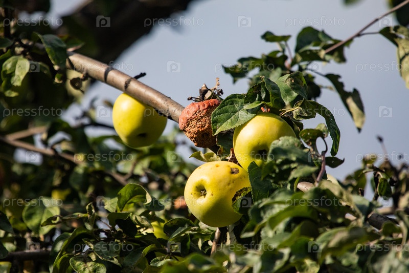 Зрелые яблоки и гниющее яблоко на яблони