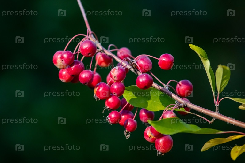 Ветвь ягодного яблоневого дерева (Malus baccata), также известного как сибирское яблоня, с маленькими красными плодами и зелеными листьями