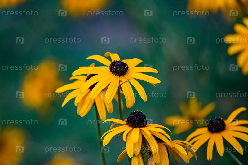 Цветки Yellow Rudbekia цветут на зеленом фоне