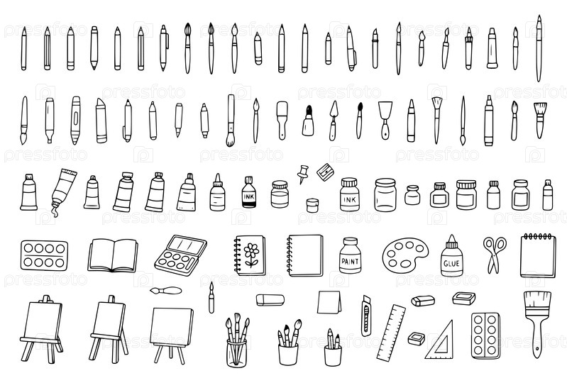 Набор векторных рисунков в стиле doodle. художественные принадлежности: цветные трубки, кисти, карандаши, маркеры, акварели, гуачи, палитра и карандаши. иллюстрация вектора