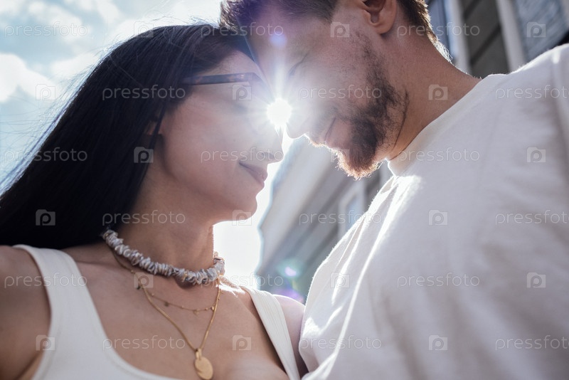 Пара обнимается на солнечном свете, демонстрируя любовь и связь, а мягкий солнечный свет создает теплую и романтическую атмосферу, подчеркивая их радостные выражения