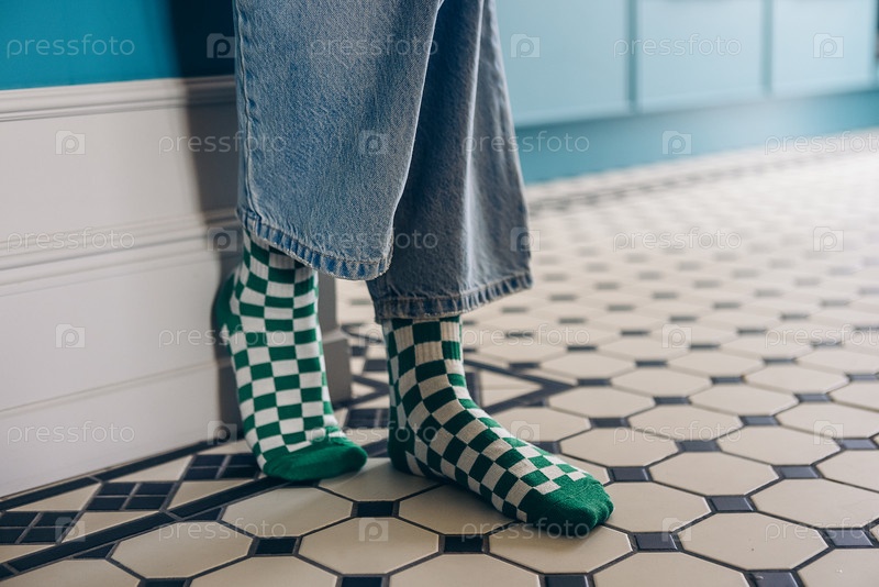 Индивидуальное ношение зеленых и белых кадравых носков стоит на узорно-пометанном плиточном полу, демонстрируя повседневную моду и комфорт в стильной помещенной среде с яркими цветами