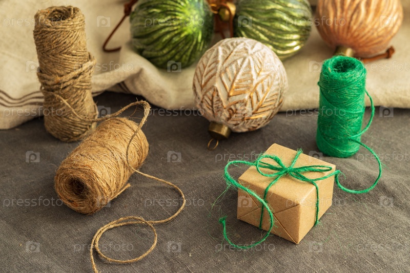 Подарочная коробка, завернутая в коричневую бумагу и связанная ютовой нитью, окружена украшениями рождественской елки