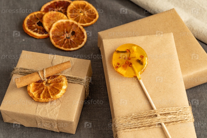 Подарочная коробка, завернутая в коричневую бумагу и связанная веревкой, украшенная сухофруктами и леденцами