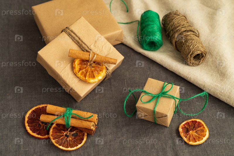 Подарочная коробка упакована в коричневую бумагу, окруженную украшениями рождественской елки