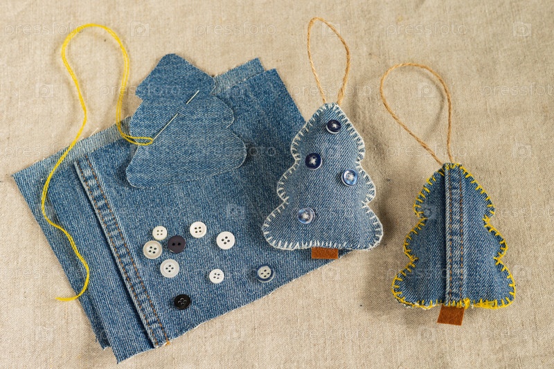 Ремесло (мягкая игрушка) своими руками в виде рождественской елки из старой джинсовой ткани и пуговиц