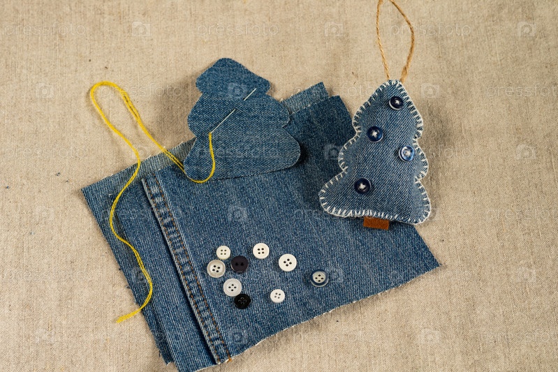 Ремесло (мягкая игрушка) своими руками в виде рождественской елки из старой джинсовой ткани и пуговиц