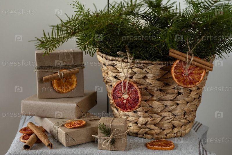 Новогодняя натюрмортная картина - ветви пихты в корзине и подарки, упакованные в коричневую бумагу для ремесленников, украшенные нарезами апельсина и палочками корицы