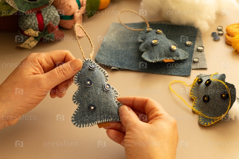 Ремесло (мягкая игрушка) своими руками в виде рождественской елки из старой джинсовой ткани и пуговиц