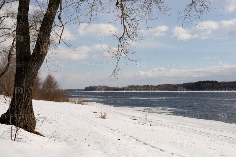 Река Кама, Удмуртия, деревня Сидоровий Горы, покрытая льдом и снегом в солнечный зимний морозный день