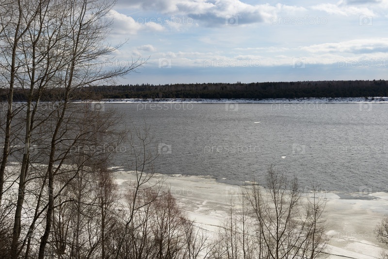 Река Кама, Удмуртия, деревня Сидоровий Горы, покрытая льдом и снегом в солнечный зимний морозный день