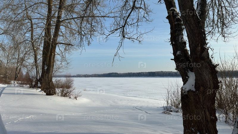 Река Кама, Удмуртия, деревня Сидоровий Горы, покрытая льдом и снегом в солнечный зимний морозный день