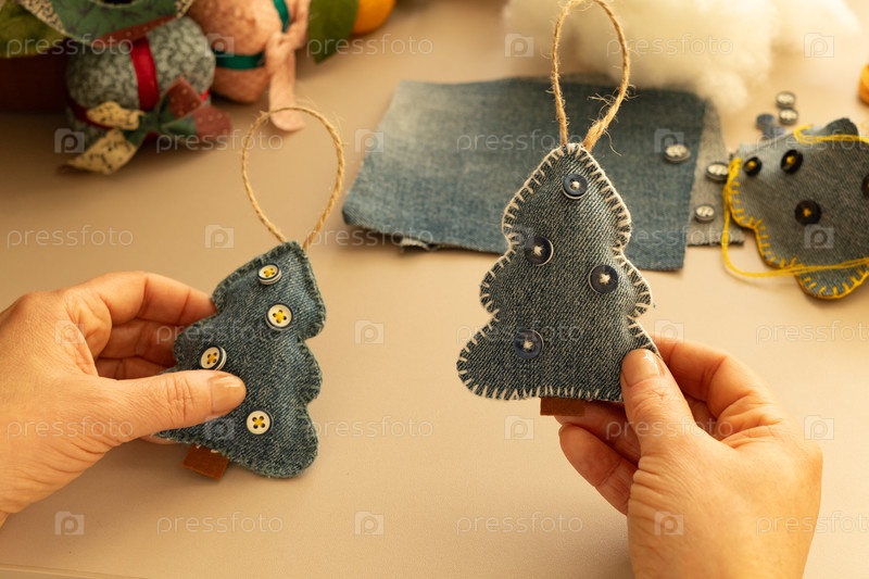 Ремесло (мягкая игрушка) своими руками в виде рождественской елки из старой джинсовой ткани и пуговиц