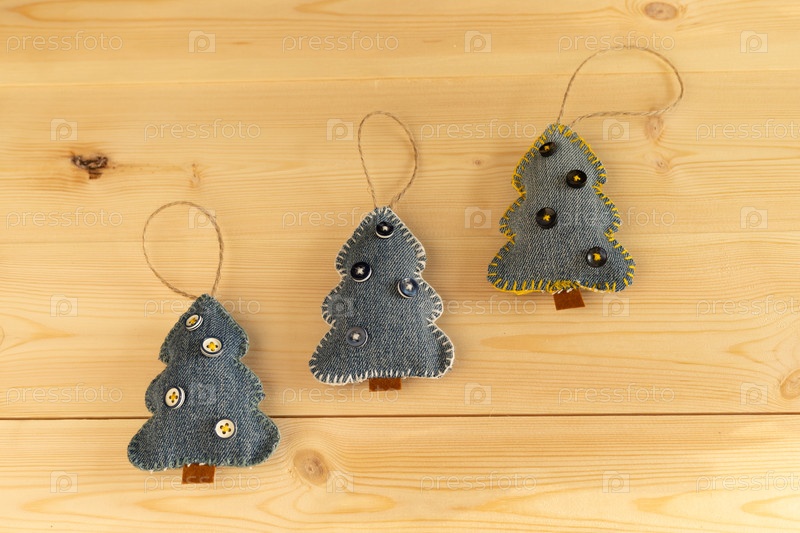 Ремесло (мягкая игрушка) своими руками в виде рождественской елки из старой джинсовой ткани и пуговиц