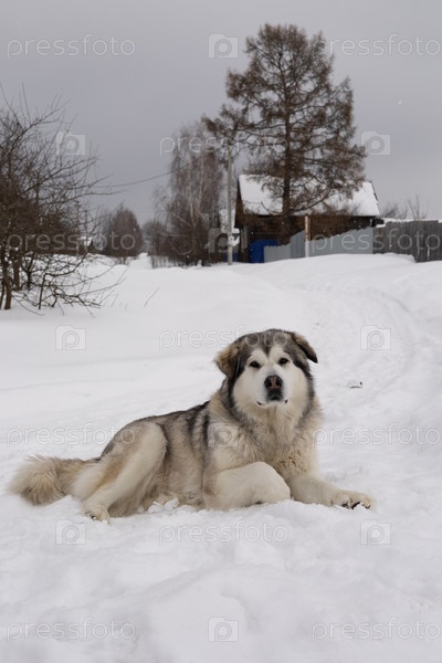 Большая пушистая собака Husky Malamute в зимний снежный день