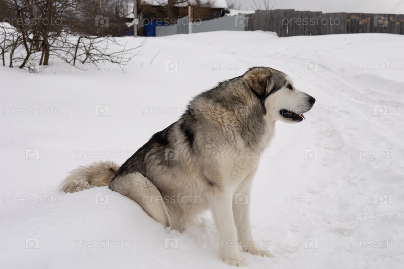 Большая пушистая собака Husky Malamute в зимний снежный день
