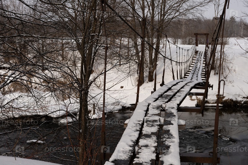 Подвесный мост через реку в зимний день