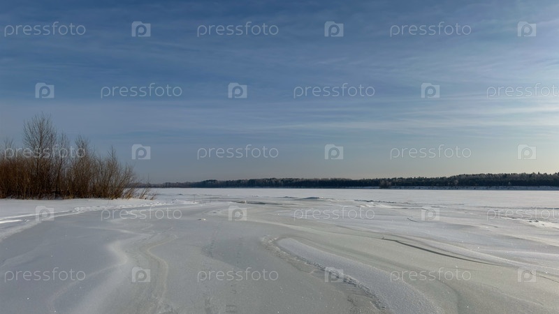 Река Кама покрыта льдом и снегом в солнечный зимний морозный день